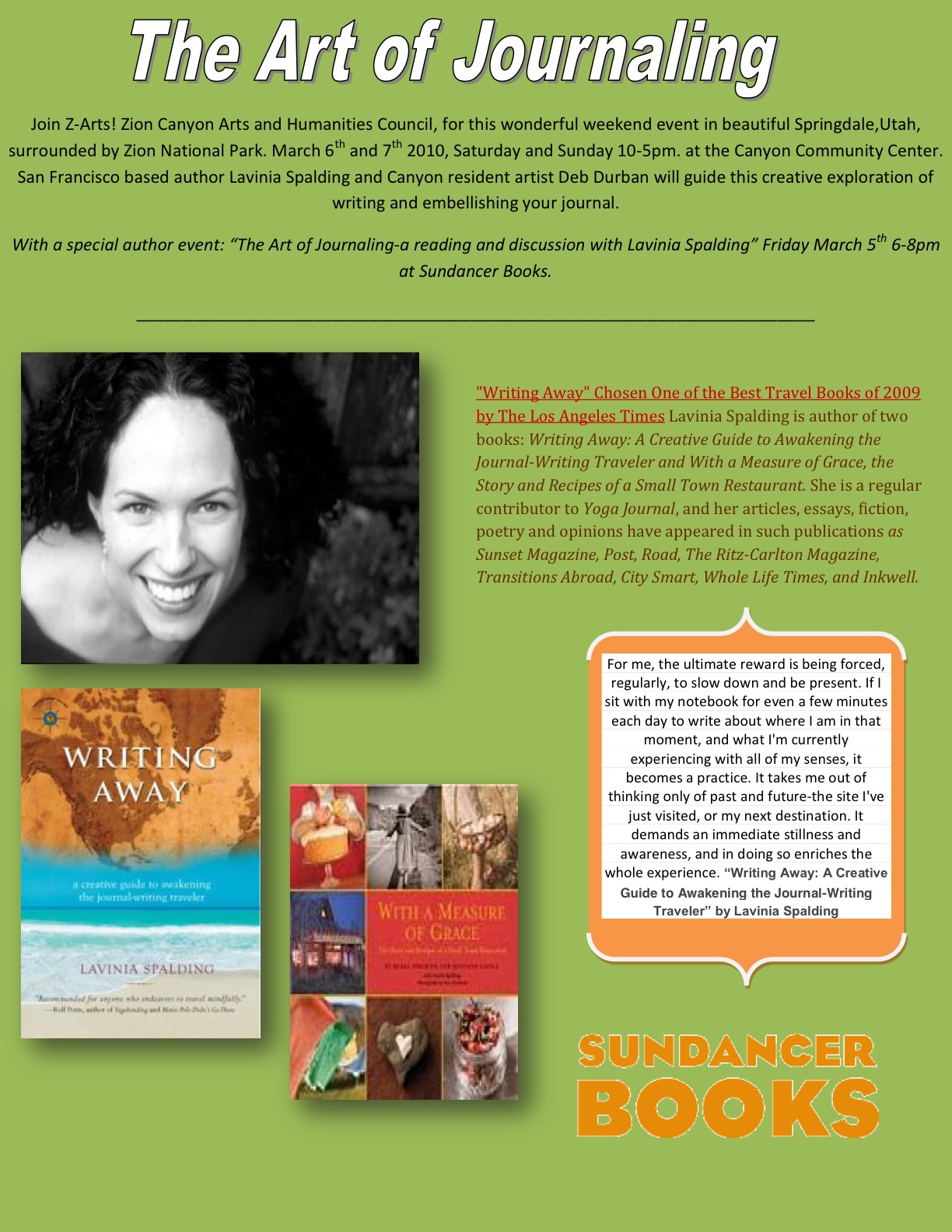 There is also a special event free and open to everyone Friday, March 5th.6-8 pm. “The Art of Journaling- a reading and discussion with Lavinia Spalding” hosted by Sundancer Books, 975 Zion Park Blvd.